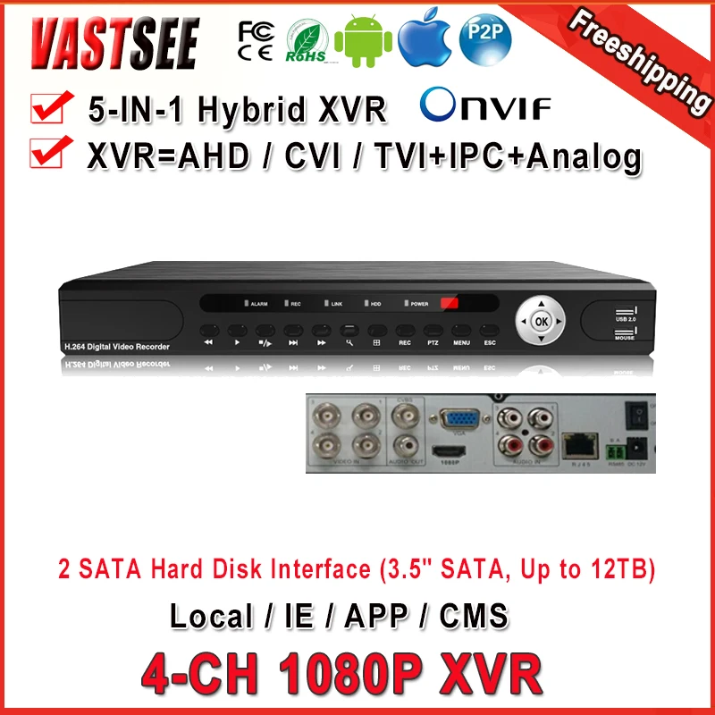 Main Features : 4Channel 1080P Hybrid XVR for AHD-H AHD-M/CVI/TVI DVR 960H D1 P2P IP recorder ONVIF Network NVR H.264 for 2MP IP Camera